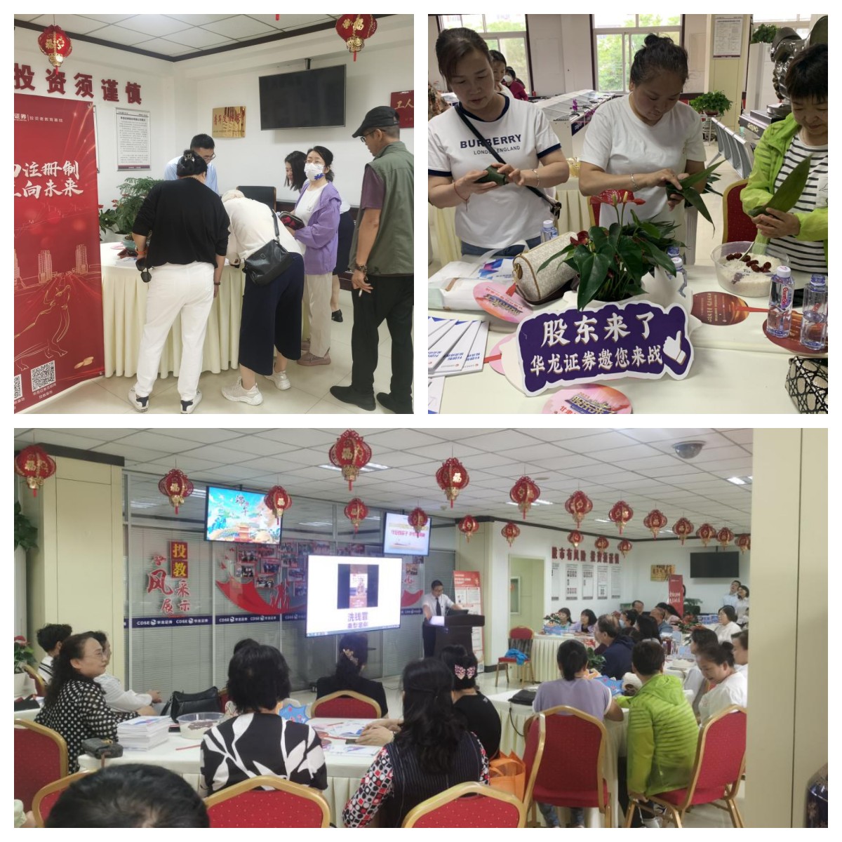 同時(shí),營(yíng)業(yè)部組織現(xiàn)場(chǎng)投資者開(kāi)展了“包粽子、享傳統(tǒng)”的活動(dòng),展粽葉、做漏斗、填糯米、放紅棗、壓實(shí)、封口、捆扎,一氣呵成,在一雙雙巧手精心制作下,各式各樣的粽子成功“出爐”,活動(dòng)現(xiàn)場(chǎng)投資者和員工熱情互動(dòng),歡聲笑語(yǔ)不斷。活動(dòng)結(jié)束后,投資者們紛紛表示“不僅參與了有趣的活動(dòng)環(huán)節(jié),還增加了金融知識(shí)的了解,非常有意義”。