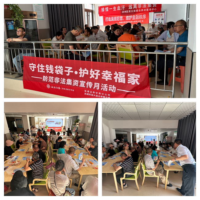 為提高老年人風(fēng)險防范和識別能力,進一步加大防范養(yǎng)老領(lǐng)域非法集資宣傳力度,2023年6月21日上午,海通證券武威祁連大道營業(yè)部走進涼州區(qū)西大街綜合養(yǎng)老服務(wù)中心開展“守住錢袋子·護好幸福家”及反洗錢宣傳活動。