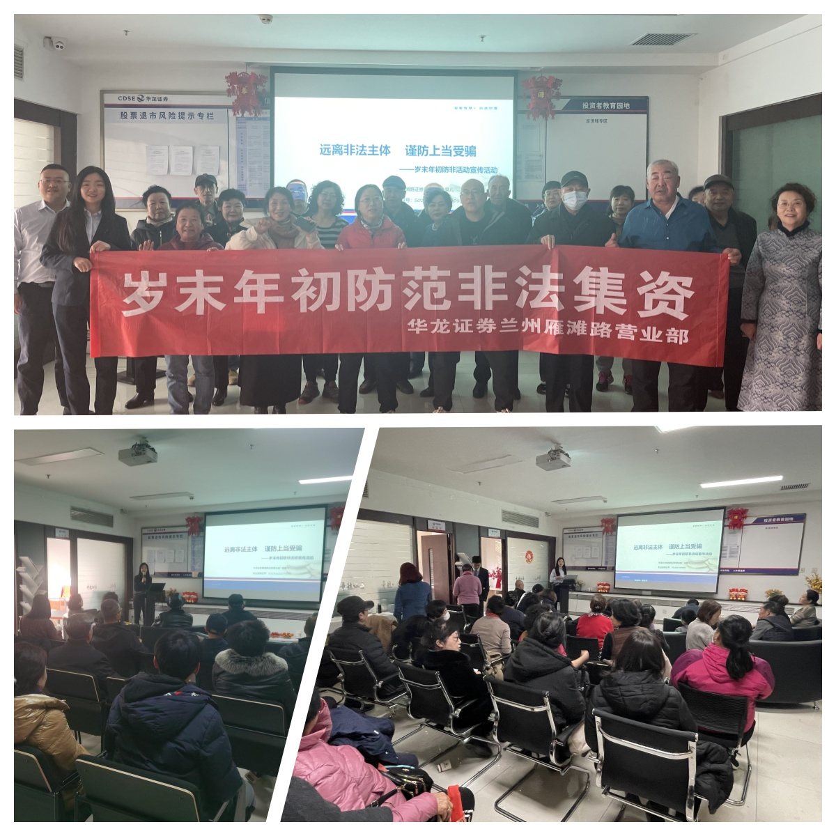 “千門萬戶曈曈日,總把新桃換舊符”,又到辭舊迎新的春節(jié)前夕,隨著中華民族最重要傳統(tǒng)節(jié)日的來臨,由消費欲望帶動的資金需求驟增,非法集資活動也進入高發(fā)期。為進一步提高投資者理性投資意識,加深投資者對非法集資危害嚴重性的認識,引導金融消費者自覺遠離非法集資,保障投資者合法權(quán)益,華龍證券蘭州雁灘路證券營業(yè)部開展了一系列防非宣非活動。