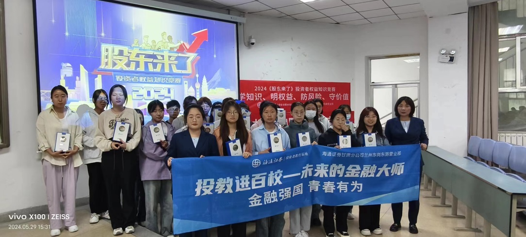 隨著金融行業(yè)的快速發(fā)展,金融知識(shí)普及和投資者教育顯得尤為重要。為更好的推進(jìn)將投資者教育納入國(guó)民教育體系,落實(shí)“投資者教育進(jìn)百?!睂?zhuān)項(xiàng)活動(dòng),海通證券投教基地?cái)y手甘肅分公司于2024年5月29日走進(jìn)蘭州財(cái)經(jīng)大學(xué)會(huì)計(jì)學(xué)院組織開(kāi)展“未來(lái)的金融大師——金融強(qiáng)國(guó)青春有為”投教進(jìn)百校專(zhuān)題活動(dòng)暨《股東來(lái)了》(2024)投資者權(quán)益知識(shí)競(jìng)賽活動(dòng)。本次活動(dòng)由海通證券甘肅分公司、蘭州東崗東路營(yíng)業(yè)部承辦。