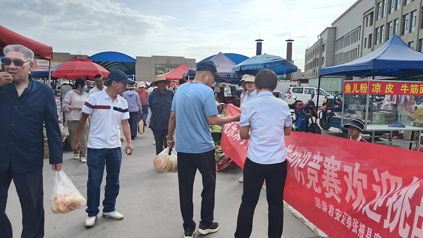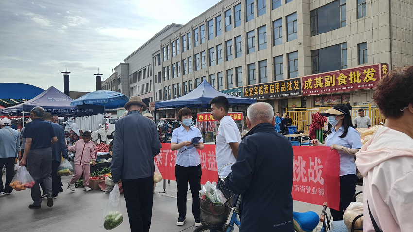 綠洲市場是張掖市的繁華地帶,人流量大,商戶眾多,是宣傳活動的理想場所,營業(yè)部的同事放棄了寶貴的周末休息時間,一大早就來到市場,準(zhǔn)備開始今天的宣傳活動。