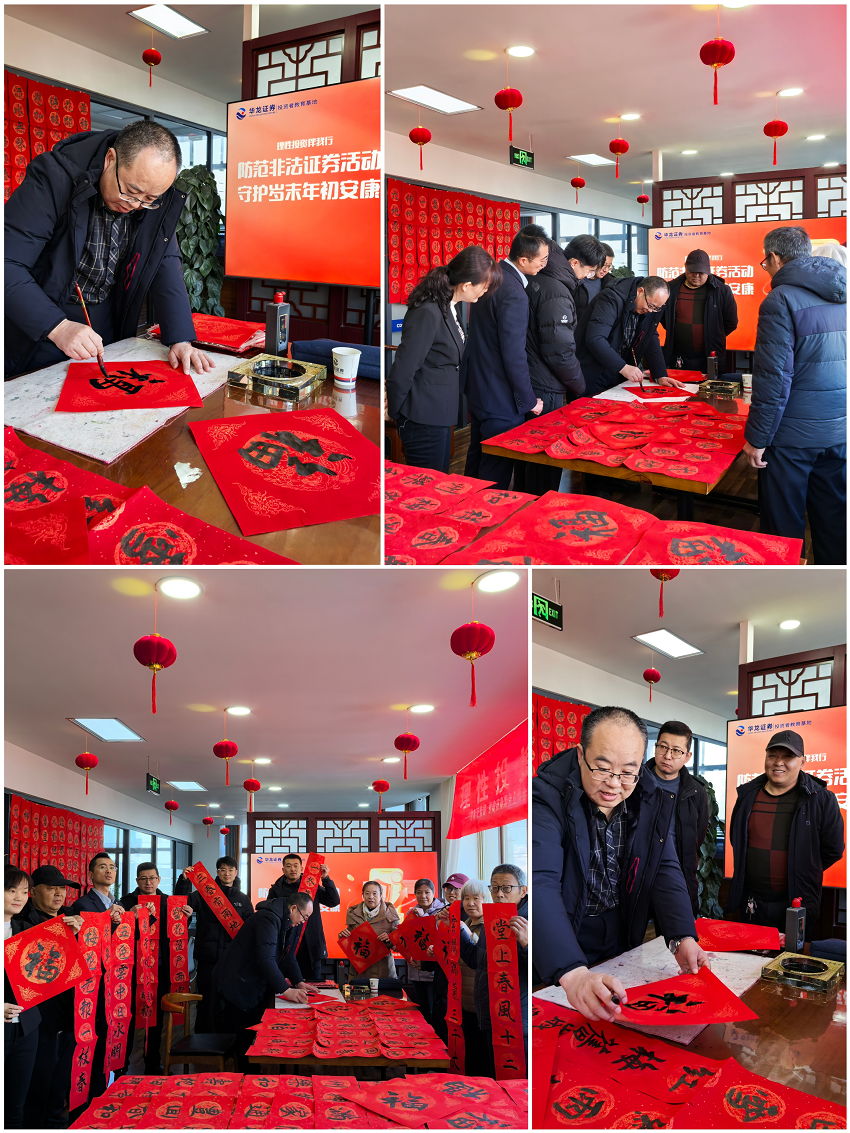 屠蘇新釀喚春風(fēng),桃符更新映日紅。春聯(lián)作為中華民族傳統(tǒng)文化的獨(dú)特符號(hào),承載著人們對(duì)新年的熱切期盼和對(duì)美好生活的深情向往。一幅幅寓意喜慶的春聯(lián),一個(gè)個(gè)飽含神韻的福字,躍然紙上,散發(fā)出濃濃的年味。在為投資者贈(zèng)送春聯(lián)、傳達(dá)祝福的同時(shí),我們進(jìn)一步加強(qiáng)與客戶的溝通交流,完善客戶信息,增強(qiáng)客戶與營(yíng)業(yè)部的黏性。活動(dòng)現(xiàn)場(chǎng),墨香四溢,其樂(lè)融融,對(duì)于一些不方便來(lái)營(yíng)業(yè)部現(xiàn)場(chǎng)的客戶,我們登門(mén)拜訪,送去節(jié)日關(guān)懷。
