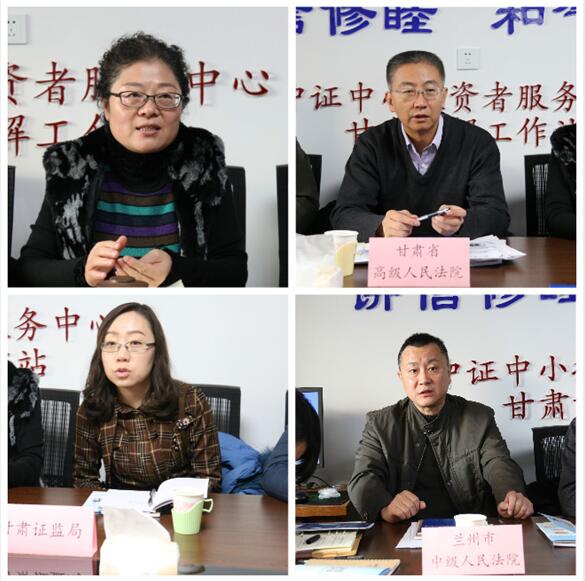 日前,最高人民法院和中國證監(jiān)會聯(lián)合召開全國證券期貨糾紛多元化解機制試點總結(jié)暨全面推進工作會議,為落實會議精神,2018年12月7日上午,甘肅省高級人民法院、蘭州市中級人民法院、甘肅證監(jiān)局、甘肅證券期貨業(yè)協(xié)會、部分證券期貨經(jīng)營機構(gòu)客服總監(jiān)及中小投資者代表近30人,齊聚中證甘肅調(diào)解工作站,舉辦司法、監(jiān)管、自律、市場主體共同參與的糾紛多元化解機制專項座談會。